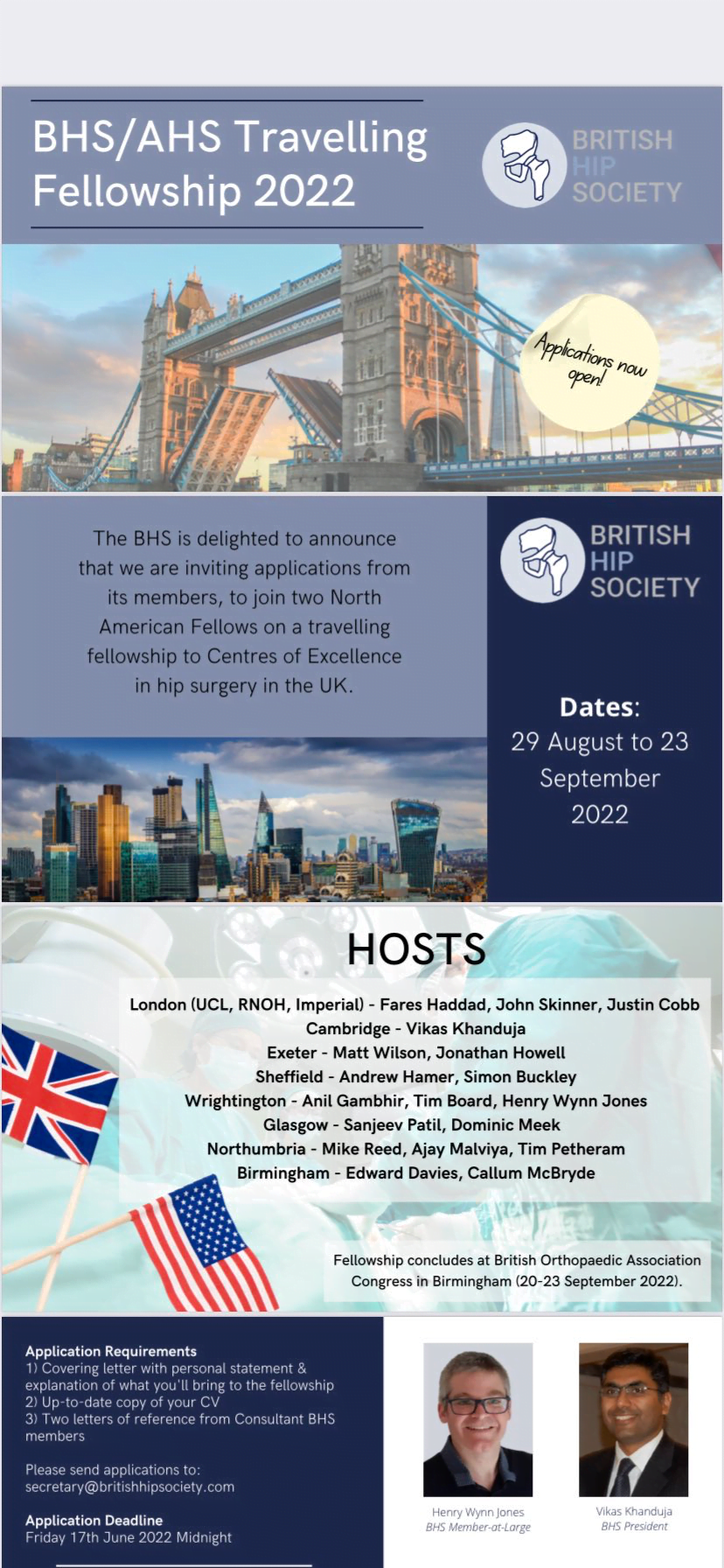 The British Hip Society is pleased to announce a fantastic opportunity in the form of a new Travelling Fellowship for our members wherein two Fellows from the BHS will travel together with two Fellows from the North American Hip Society to centres of excellence in the UK over a three-week period in September 2023 culminating at the annual BOA Congress in Birmingham. Please find further details of the Fellowship and the application process below: